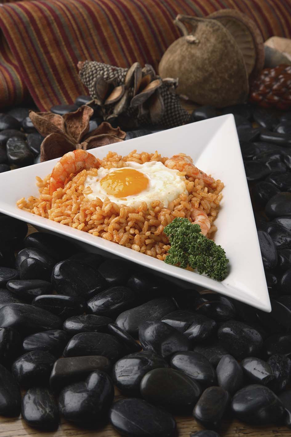 • Σερβίρουμε το ρύζι με τις γαρίδες, από πάνω τοποθετούμε το αβγό μάτι και πασπαλίζουμε με πιπέρι.