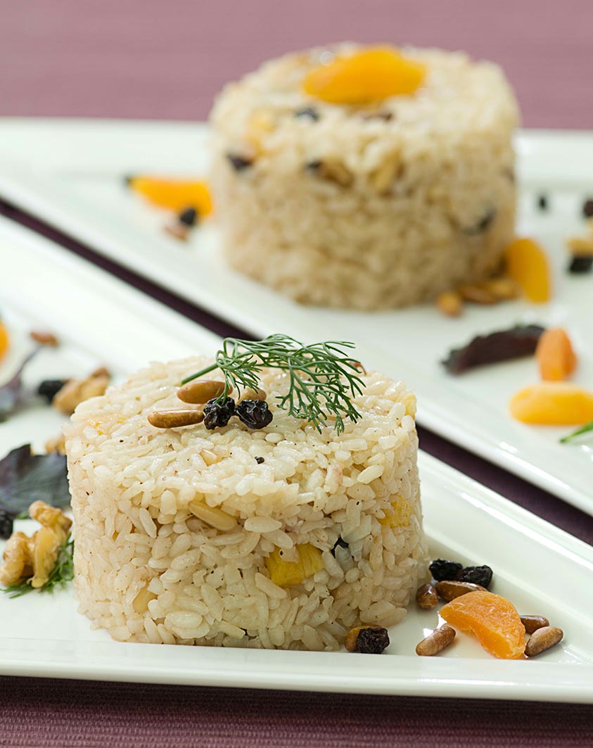 • Σερβίρουμε σε φορμάκια και γαρνίρουμε με σταφίδες, κουκουνάρια και βερίκοκα.