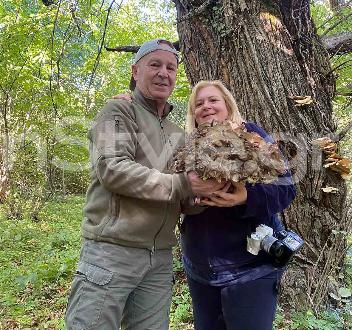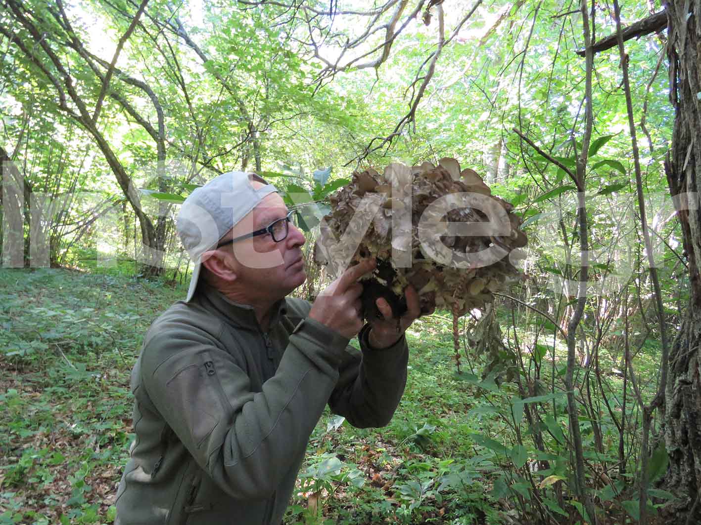 Σε νεαρή ηλικία τρώγονται και αργότερα βγάζουν μια σκόνη. Ο στρατός του Μ. Αλεξάνδρου τη χρησιμοποιούσε σαν αιμοστατική για τα τραύματα και για την επούλωση των εγκαυμάτων. Ξαφνιαστήκαμε με τις κραυγές χαράς του Παναγιώτη, που πρέπει να ξύπνησε και τα πιο τεμπέλικα αγριμάκια. Στα πόδια μας εμφανίζεται μια ακόμα μανιταριά, με ένα τεράστιο μανιτάρι Grifola frondosa 8 κιλών και ολόγυρα κάποια μικρότερα. Είναι ένα μανιτάρι πολύτιμο και ιδιαίτερα σπάνιο στην Ελλάδα. Εμφανίζεται στις αρχές του φθινοπώρου. Είναι πολύ νόστιμο, ένα δώρο από το φαρμακείο της φύσης στον άνθρωπο. Είναι ενδημικό μανιτάρι της Κίνας και της Ιαπωνίας, γνωστό σαν maitake, όπου mai σημαίνει χορός και take μανιτάρι, ενώ οι κινέζοι το αποκαλούν γκρι λουλούδι του δέντρου. Η υφή του βελούδινη και το χρώμα ίδιο με του δέντρου.