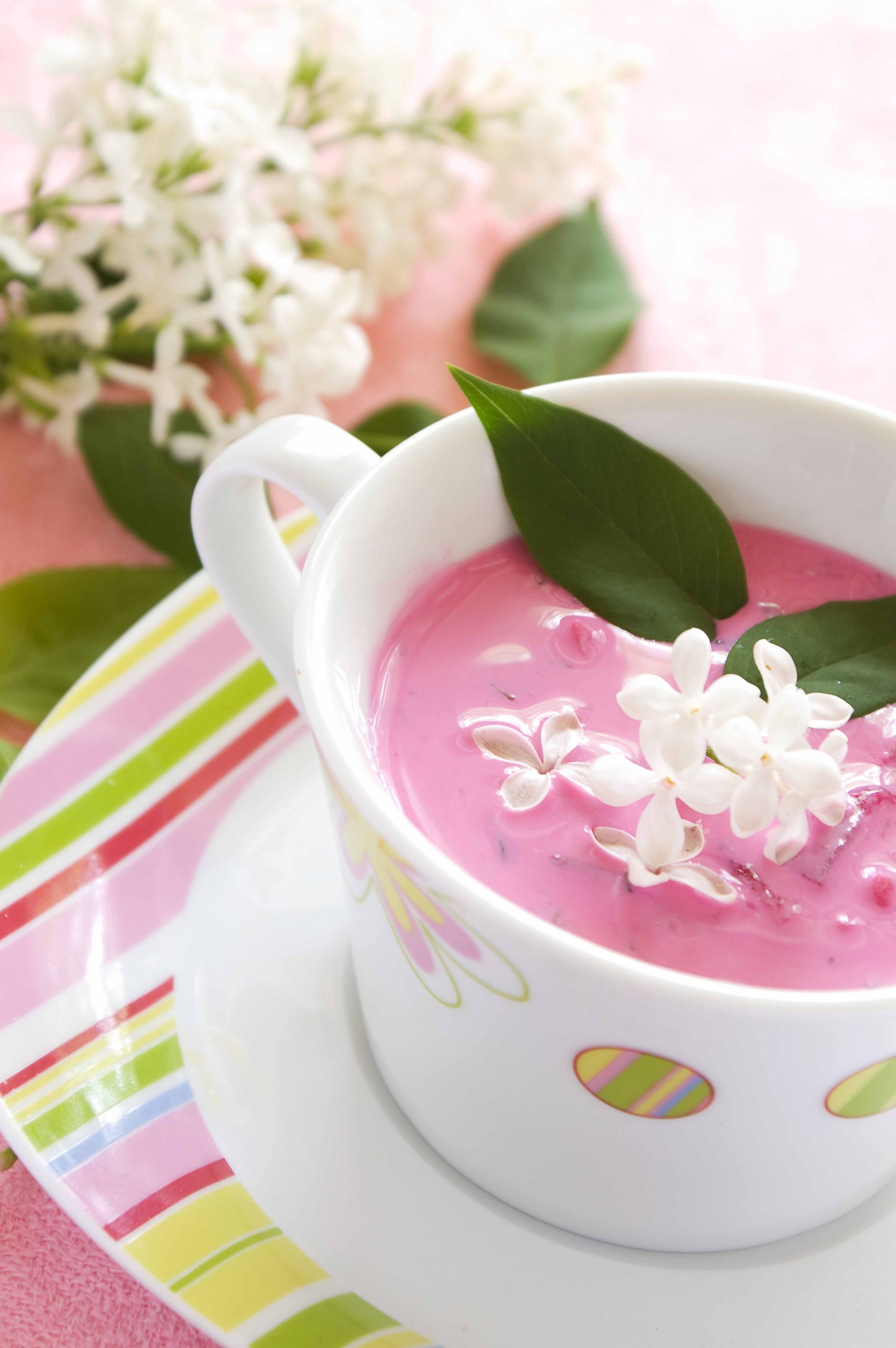 • Μοιράζουμε την κρύα σούπα σε μπολάκια και προσθέτουμε λίγο από το μείγμα του γιαουρτιού. Σερβίρουμε, διακοσμώντας αν θέλουμε με άνθη γιασεμιού.