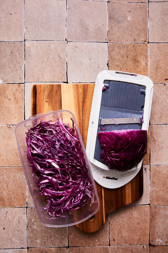 - Στη συνέχεια, κόβετε το κόκκινο λάχανο όσο πιο λεπτό γίνεται, ιδανικά με μαντολίνο, τα καρότα σε στικς ή τα τρίβετε, τις πιπεριές σε στικς, τα μπιζέλια στη μέση ή τα αφήνετε ολόκληρα, το φρέσκο κρεμμυδάκι σε φετούλες και ψιλοκόβετε τον κόλιανδρο.