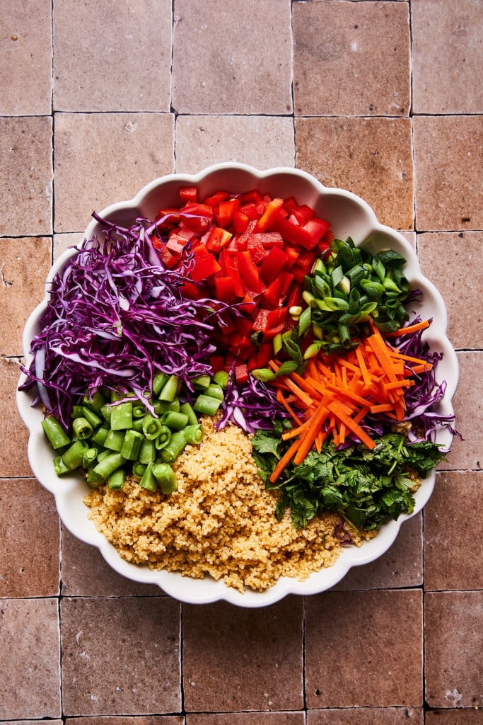 - Αρχικά, μαγειρεύετε την κινόα σύμφωνα με τις οδηγίες της συσκευασίας. Όταν είναι έτοιμη, την ανακατεύετε απαλά με ένα πιρούνι και την αφήνετε να κρυώσει ώστε να μη μαραθούν τα λαχανικά όταν τη συνδυάσετε.