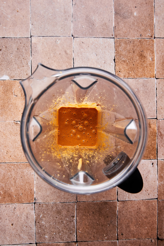 - Όσο μαγειρεύεται η κινόα, ετοιμάζετε τη σάλτσα. Σε ένα μπλέντερ βάζετε το φιστικοβούτυρο, τη σάλτσα σόγιας, το ξίδι ρυζιού, το σησαμέλαιο, τον χυμό λάιμ, το νερό, το μέλι, το λάδι chili crisp και το σκόρδο και τα χτυπάτε μέχρι να έχετε μια λεία, ομοιόμορφη σάλτσα.