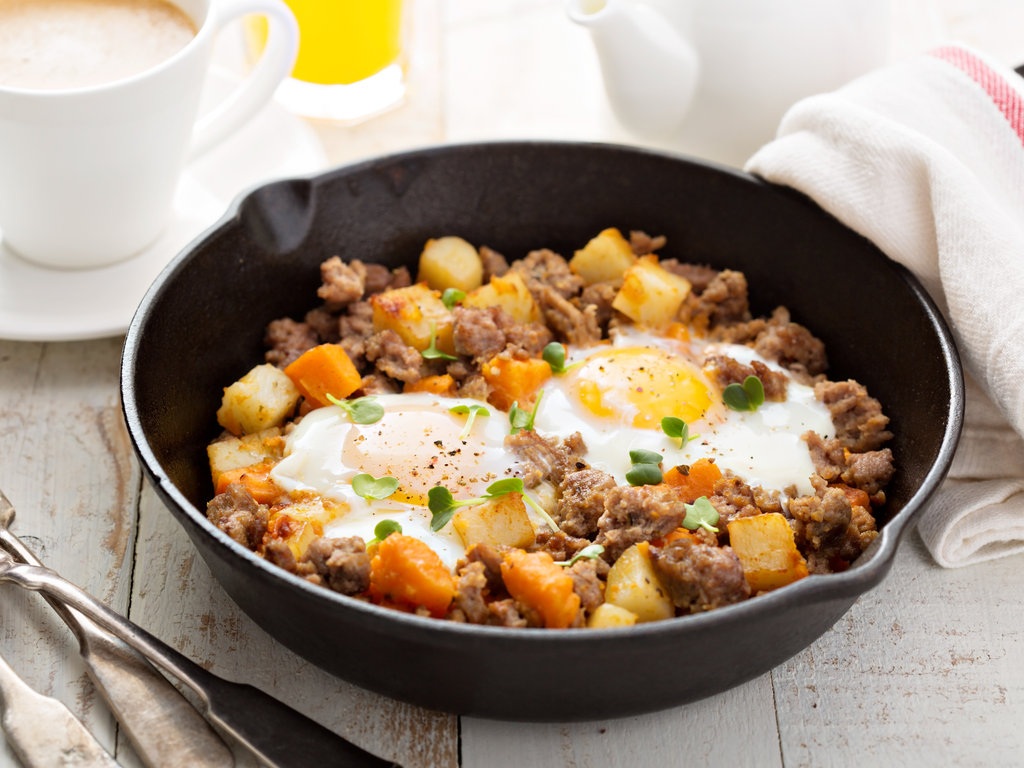 Είτε ξαναζεστάνετε τις πατάτες είτε φτιάξετε μια φρέσκια παρτίδα, πρέπει να είναι κομμένες σε κύβους πριν πέσουν στο τηγάνι με τα συνοδευτικά που έχετε επιλέξει: πιπεριές, κολοκύθα, κολοκυθάκια και κρεμμύδια. Μόλις ψηθούν όλα και ροδίσουν οι πατάτες, τις σερβίρετε με ένα τηγανητό αβγό από πάνω. Το ίδιο πιάτο μπορεί να φτιαχτεί και με γλυκοπατάτες.