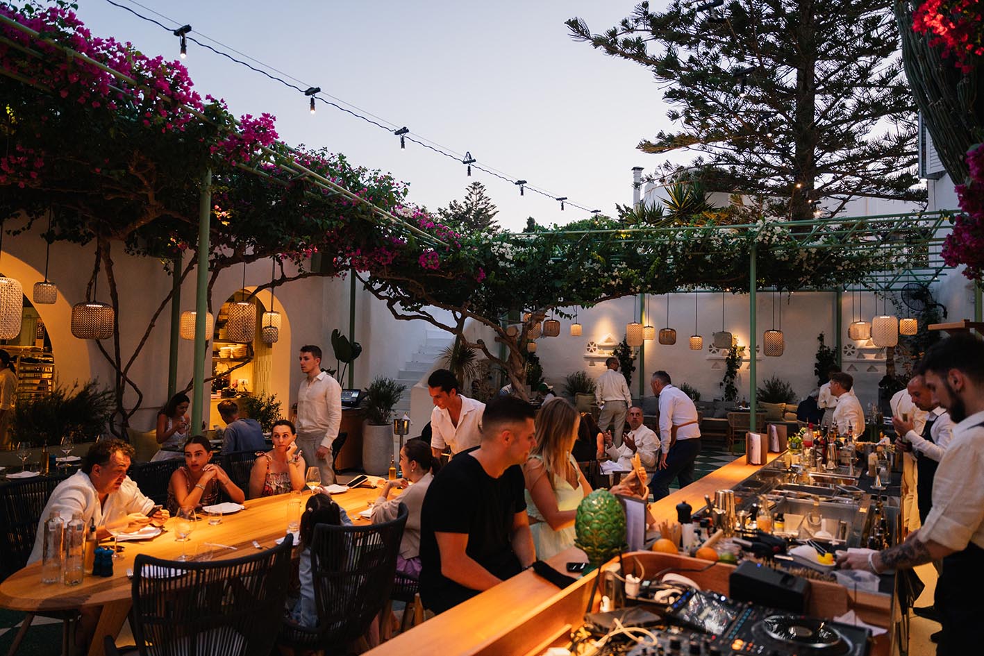 Μια φυσική προέκταση της αρχιτεκτονικής και της συναρπαστικής κυκλαδίτικης ατμόσφαιρας, ο μαγευτικός χώρος του πλημμυρίζει από τα έντονα χρώματα των αναρριχώμενων φυτών και υπόσχεται να παρασύρει τους επισκέπτες σε μια εμπειρία γεύσεων και αρωμάτων που θα μείνει έντονα χαραγμένη στο μυαλό – αλλά και πάνω από όλα – στον ουρανίσκο όλων.