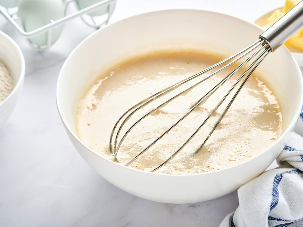 - Ρίξτε τα υγρά υλικά στα στερεά υλικά και ανακατέψτε απαλά μέχρι να ομογενοποιηθούν. Μην ανακατεύετε υπερβολικά, καθώς μικροί κόμποι είναι επιθυμητοί για αφράτα pancakes.