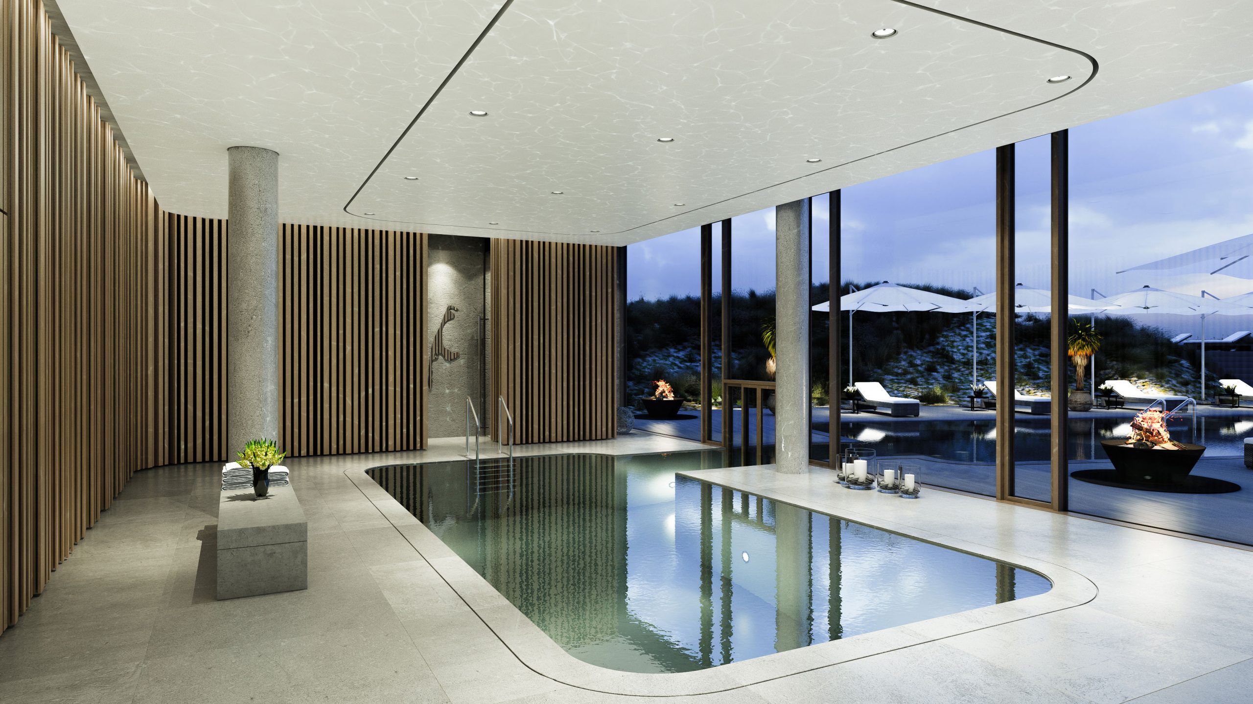 Υπάρχουν ακόμη δύο πισίνες θαλασσινού νερού- εσωτερική και εξωτερική- που συνδέονται μεταξύ τους. Μια εντυπωσιακή πενταόροφη και ανεξάρτητη σπειροειδής σκάλα, χρησιμεύει ως κεντρικό σημείο για εναλλακτική πρόσβαση σε επιμέρους προορισμούς.