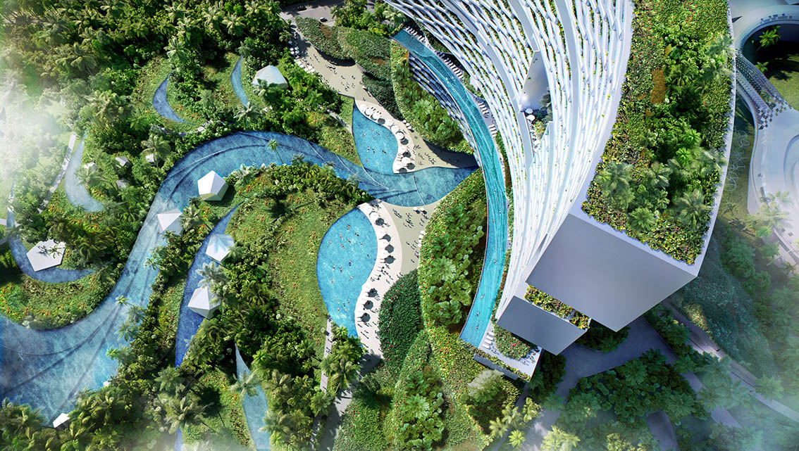 Ανάμεσα στους οικοδομικούς όγκους έχει προβλεφθεί μια ποικιλία από φυσικές φυτεύσεις και κήπους που θα αναδείξουν όλη την εγκατάσταση, διπλασιάζοντας σχεδόν την ποσότητα πρασίνου. Δημιουργώντας ουσιαστικά μια κάθετη ‘ζούγκλα’, οι επονομαζόμενοι «κρεμαστοί κήποι» θα βιωθούν ουσιαστικά από τους φιλοξενούμενους κάθε ορόφου και κάθε δωματίου, προσφέροντας μια ανεπανάληπτα ολιστική εμπειρία ενός τροπικού θέρετρου.