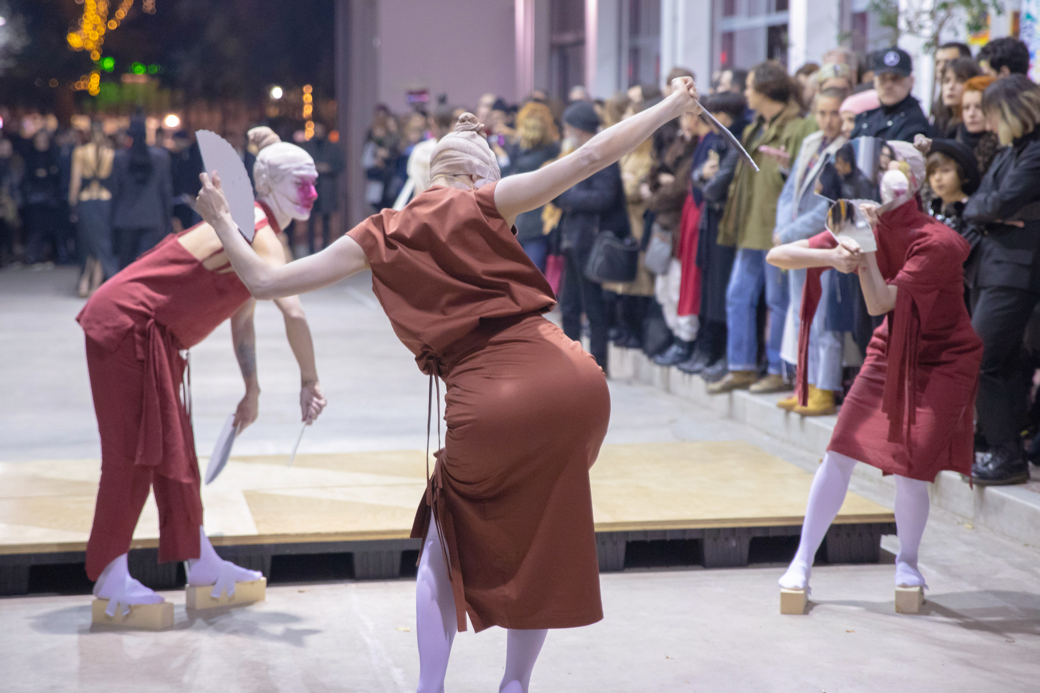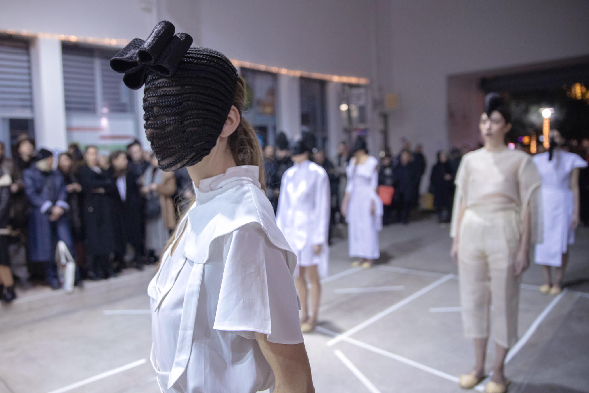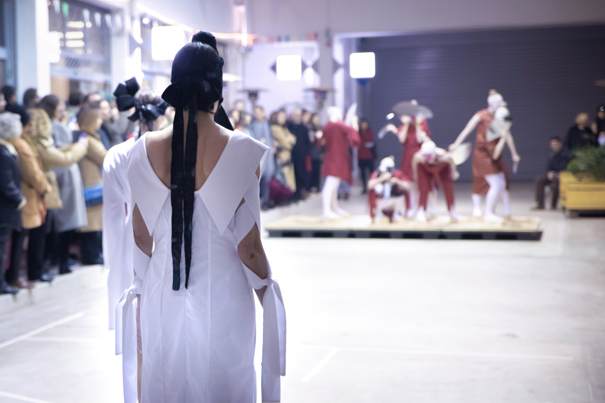Με έντονες επιρροές από την Κινέζικη Όπερα, τα άκρως επιβλητικά γλυπτά-headpieces της Μαριάννας Ιγνατάκη, κατασκευασμένα από συνθετική τρίχα από την Κίνα, ύφασμα και νήμα, σε συνδυασμό με το καθηλωτικό live performance της Άννας Παπαθανασίου με τη συνοδεία της εξαμελούς χορευτικής ομάδας της, υπό τους ήχους συγχρόνων πειραματικών Κινέζων συνθετών, και σε μια απόλυτη αρμονία με την S/S’20 συλλογή των 2WO+1NE=2, είχαν στόχο να συνεπάρουν τους προσκεκλημένους σε ένα ονειρικό ταξίδι στην μεγαλύτερη πόλη της Κίνας, τη Σαγκάη, μεταφέρνοντάς τους σαν θεατές όπερας σε ένα Κινέζικο Street Τheater -γεγονός στο οποίο συντέλεσε και η επιλογή του urban χώρου της Δημοτικής Αγοράς Κυψέλης -.