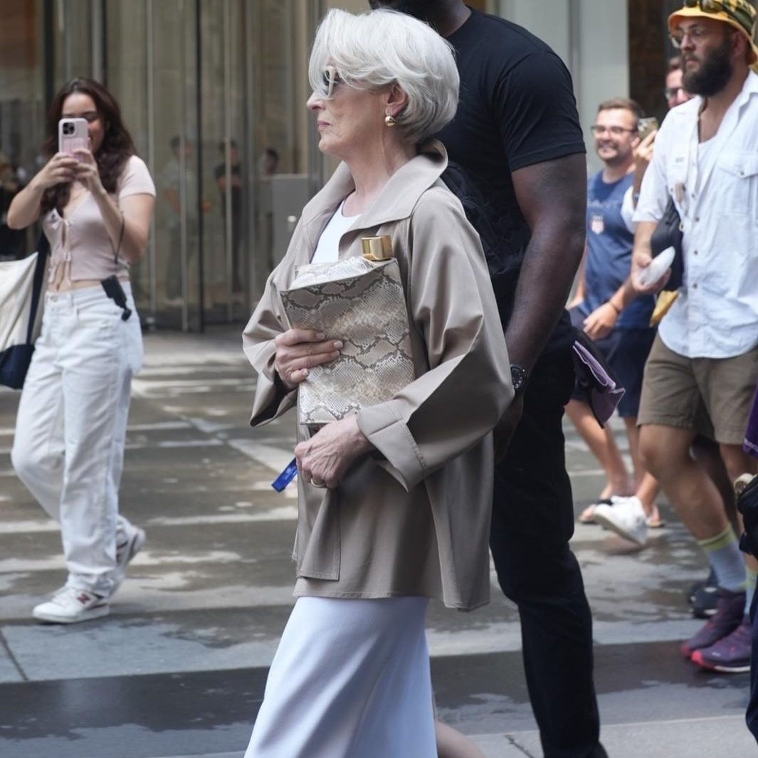 Πριν συνέλθουμε από την εμφάνισή της με τα φλογερά κόκκινα παπούτσια, η Meryl Streep ή αλλιώς η απόλυτη Miranda Priestly ξαναχτυπά στα γυρίσματα του The Devil Wears Prada 2. Αυτή τη φορά, με ένα μίντι λευκό φόρεμα, μπεζ καπαρντίνα και αυστηρές μαύρες γόβες. Το fashion twist που έκλεψε την παράσταση; Η La Pochette Rond Carré του Jacquemus, σε snake print. Μια τσάντα που δεν φωνάζει, αλλά ψιθυρίζει κομψότητα με τον πιο σαγηνευτικό τρόπο. Και κάπως έτσι, η Meryl επιβεβαιώνει πως το animal print επιστρέφει ανανεωμένο και εκλεπτυσμένο, ως το νέο ουδέτερο της μόδας.