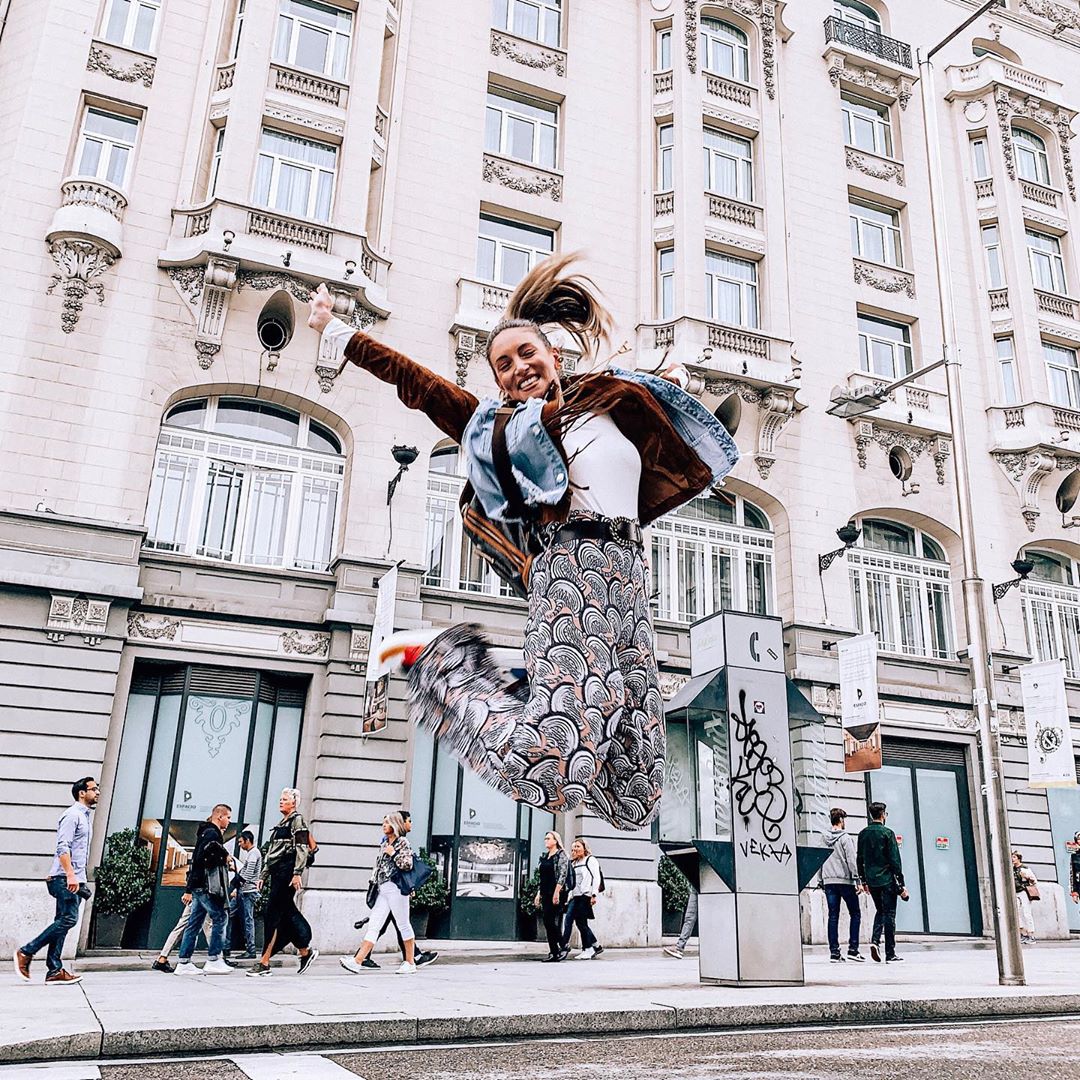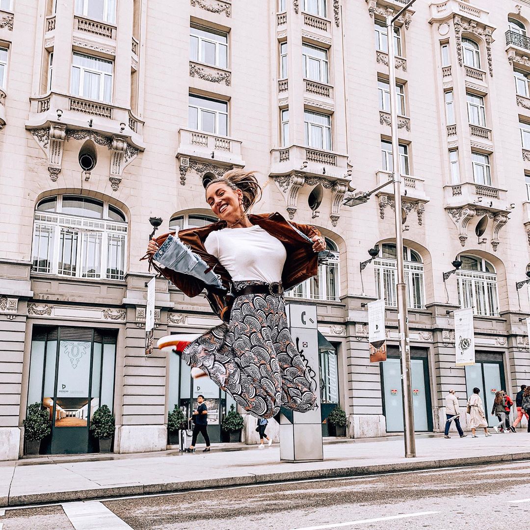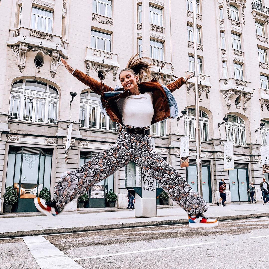 Η ηθοποιός και επιχειρηματίας ανέβασε μία φωτογραφία στο προφίλ της στο Instagram από το ταξίδι της στη Μαδρίτη και μας δείχνει πως θα φορέσουμε την αγαπημένη μας παντελόνα ακόμα και αυτή την εποχή. Η Αθηνά Οικονομάκου συνδύασε μία καλοκαιρινή παντελόνα σε έντονο μοτίβο με μία λευκή μπλούζα. Ολοκλήρωσε την εμφάνιση της με ένα suede μπουφάν σε γήινες αποχρώσεις, ένα denim γιλέκο και ένα ζευγάρι sneakers.