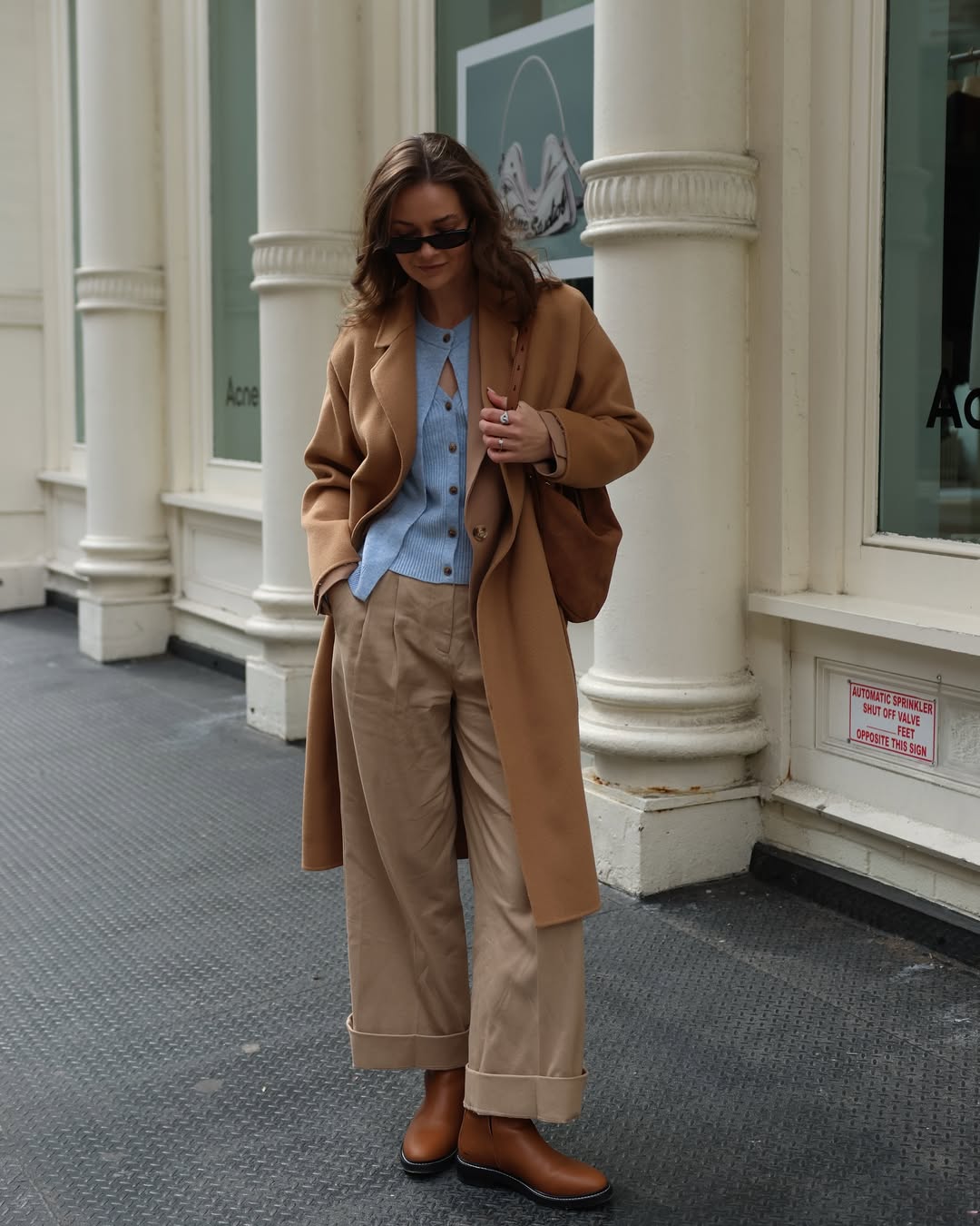 Στις πρώτες δροσερές ημέρες του φθινοπώρου, το καφέ παντελόνι με πιέτες γίνεται η πιο κομψή βάση για layering. Συνδυάζεται αρμονικά με ένα γαλάζιο μπλουζάκι και ένα rib ζακετάκι για cozy αίσθηση. Το καφέ παλτό δίνει δομή και ζεστασιά. Ολοκληρώνουμε το σύνολο με καφέ δερμάτινα μποτάκια για να πετύχουμε το απόλυτο transitional look.