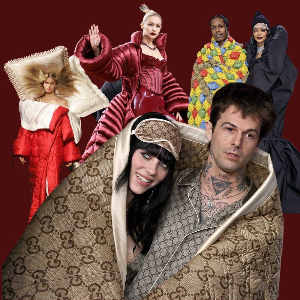 Πριν από τους τραγουδιστές και ηθοποιούς όμως, ήταν ο κόσμος της μόδας που αντιλήφθηκε τις στιλιστικές δυνατότητες των παπλωμάτων και των μαξιλαριών. Όλα ξεκίνησαν από το κλασικό “Bed Dress” της Cinzia Ruggeri, που δημιουργήθηκε αρχικά για τη Vogue Casa το 1986, δηλαδή, ένα καπιτονέ φόρεμα σε συνδυασμό με ένα σατέν μαξιλάρι, ένα στιλ που επαναπροσδιόρισαν αργότερα οι Viktor & Rolf στη συλλογή Φθινόπωρο/Χειμώνας ’05-’06 (με τον τίτλο Bedtime Story) και η Sarah Burton για τη συλλογή Alexander McQueen Φθινόπωρο/Χειμώνας ’16.