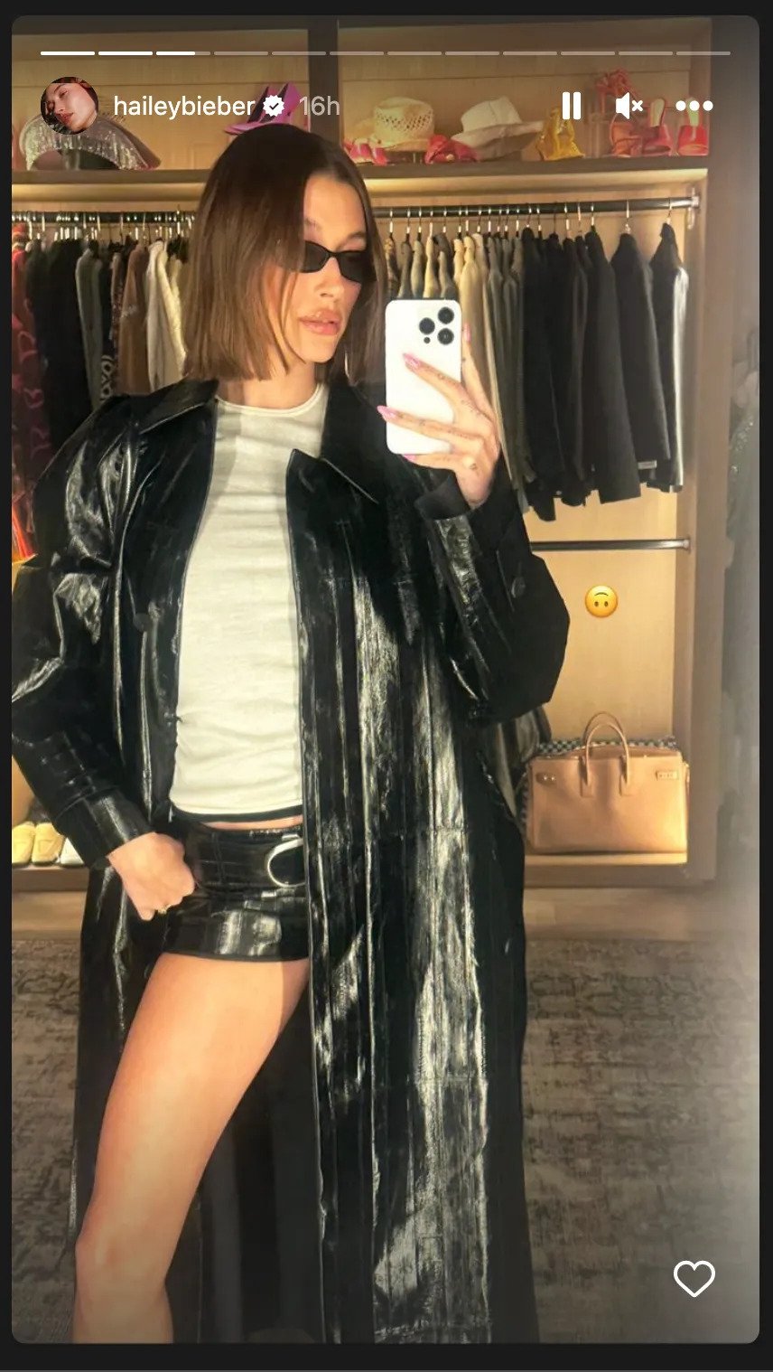 Συγκεκριμένα η Hailey μοιράστηκε φωτογραφίες από το outfit που περιλάμβανε μακριά μαύρη vinyl καμπαρντίνα και ένα μικροσκοπικό δερμάτινο σορτς με ζώνη, Ferragamo. Την εμφάνιση συμπλήρωναν μαύρες ψηλοτάκουνες γόβες Raf Simons, που έκαναν τα πόδια της να δείχνουν ακόμα πιο μακριά!