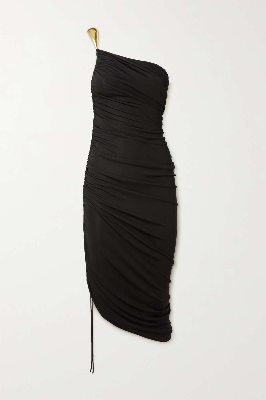 Το φόρεμα της Aniston είναι από τη συλλογή του Matthieu Blazy Resort 2023 για την Bottega Veneta και διαθέτει μια εντυπωσιακή χρυσή ράβδο στον έναν ώμο που θυμίζει το υλικό που υπάρχει στα αξεσουάρ του σχεδιαστή (όπως η λατρεμένη τσάντα Sardine του).