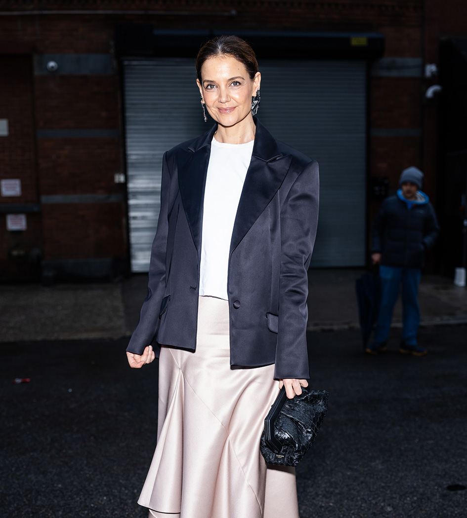 Η πρώτη φορά που είδαμε τη Holmes να δοκιμάζει αυτή τη νέα φόρμουλα ντυσίματος ήταν στην επίδειξη του Christian Siriano για τη σεζόν Φθινόπωρο/Χειμώνας 2025, που πραγματοποιήθηκε στο Chelsea Industrial.