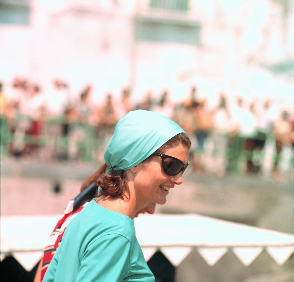 Επιστρέφοντας και πάλι στα κλασικά της, η Jackie O’ φοράει ένα κομψό 60s φόρεμα και συνδυάζει το look με μια cool μπαντάνα στα μαλλιά. Η διαχρονικότητα του φόρεμα της αναδεικνύει τη σιλουέτα της τολμώντας να δείξει λίγο παραπάνω πόδι, ενώ η μπαντάνα προσθέτει την ιδανική δόση vintage χάρης.