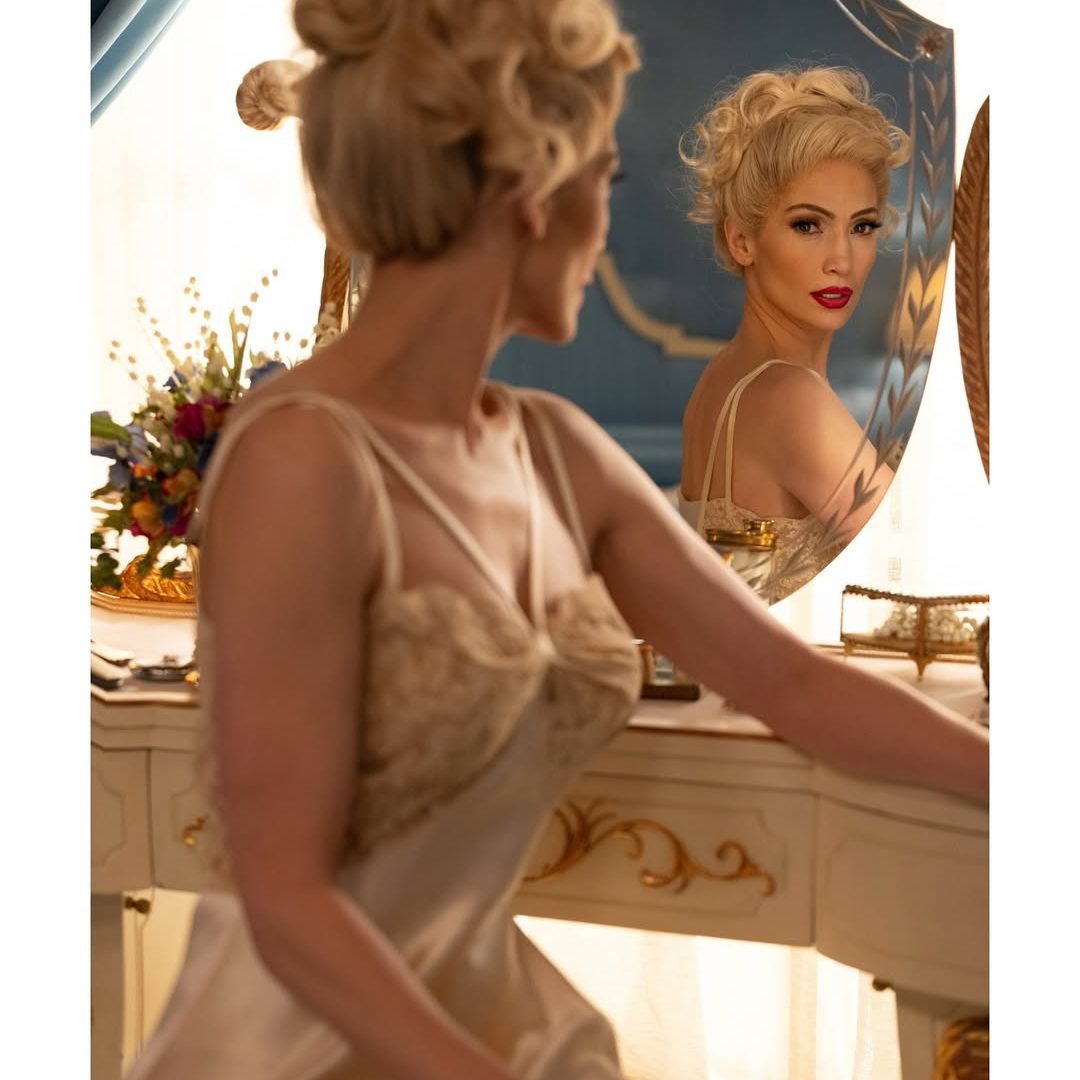 Η J.Lo κλέβει την παράσταση σε μια σκηνή-ωδή στο παλιό σινεμά φορώντας ένα σαμπανιζέ φόρεμα γεμάτο φτερά, πούλιες και κρόσσια. Μια σύγχρονη εκδοχή του glamour των ‘30s. Δημιουργία του Ralph & Russo, το look αποπνέει vintage αισθησιασμό με φουτουριστική διάθεση. Οι στρας λεπτομέρειες αντανακλούν τα φώτα της σκηνής σε κάθε της κίνηση.