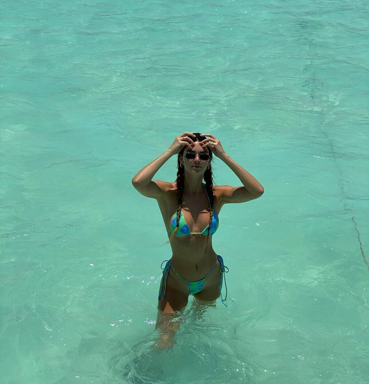 Εμπριμέ και μικροσκοπικό: στα χρώματα της θάλασσας και με κορδονάκια που προσαρμόζονται σε κάθε σώμα. Το καλοκαίρι θέλει fun και η Kendall το προσθέτει με ζωηρά prints και έντονα μοτίβα στο μαγιό.