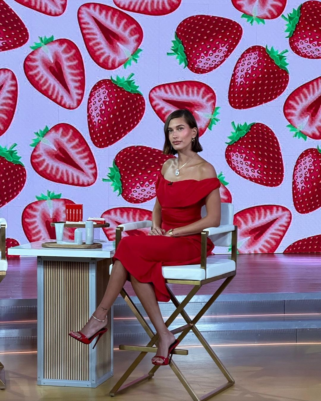 Τη Δευτέρα, το μοντέλο εντοπίστηκε έξω από τα στούντιο του Good Morning America με ένα εντυπωσιακό μονοχρωματικό σύνολο σε ρουμπινί χρώμα που αποτελούνταν από ένα off-the-shoulder φόρεμα ασορτί slide-on στιλέτο Maison Ernest και μια τσάντα από λουστρίνι.