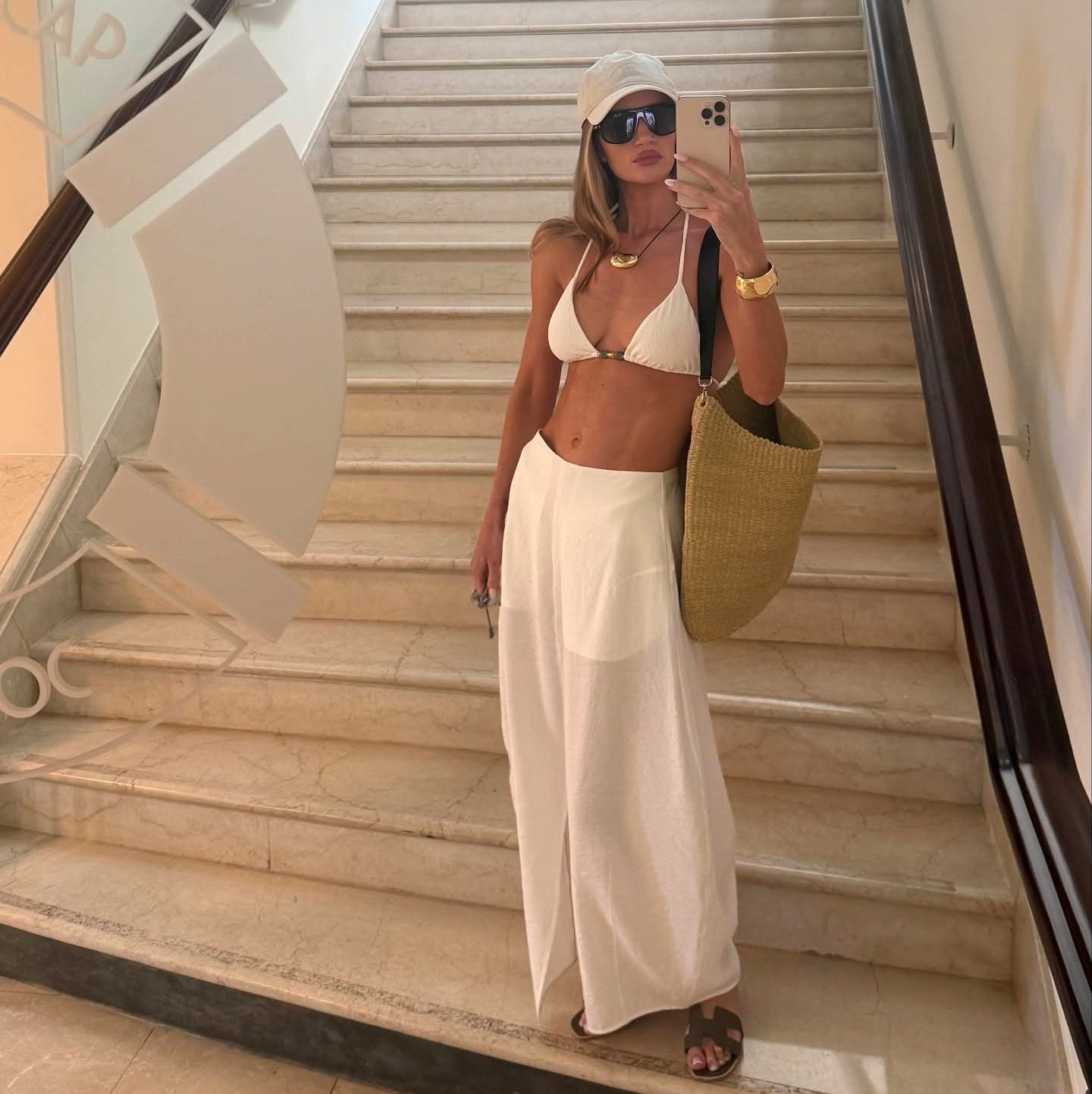 Εμφανίστηκε με ένα λινό σύνολο αποτελούμενο από λευκό πουκάμισο και wide-leg παντελόνι αποπνέοντας ανεπιτήδευτη άνεση και καλοκαιρινή ανεμελιά. Το look ολοκλήρωσε με ψάθινο καπέλο και λευκά αθλητικά σε έναν ιδανικό συνδυασμό για κομψές αλλά άνετες εμφανίσεις στο νησί. Η εμφάνισή της απέδειξε πως το λευκό είναι ο απόλυτος σύμμαχος για όσες θέλουν να ταξιδεύουν με στιλ χωρίς να θυσιάζουν την πρακτικότητα.