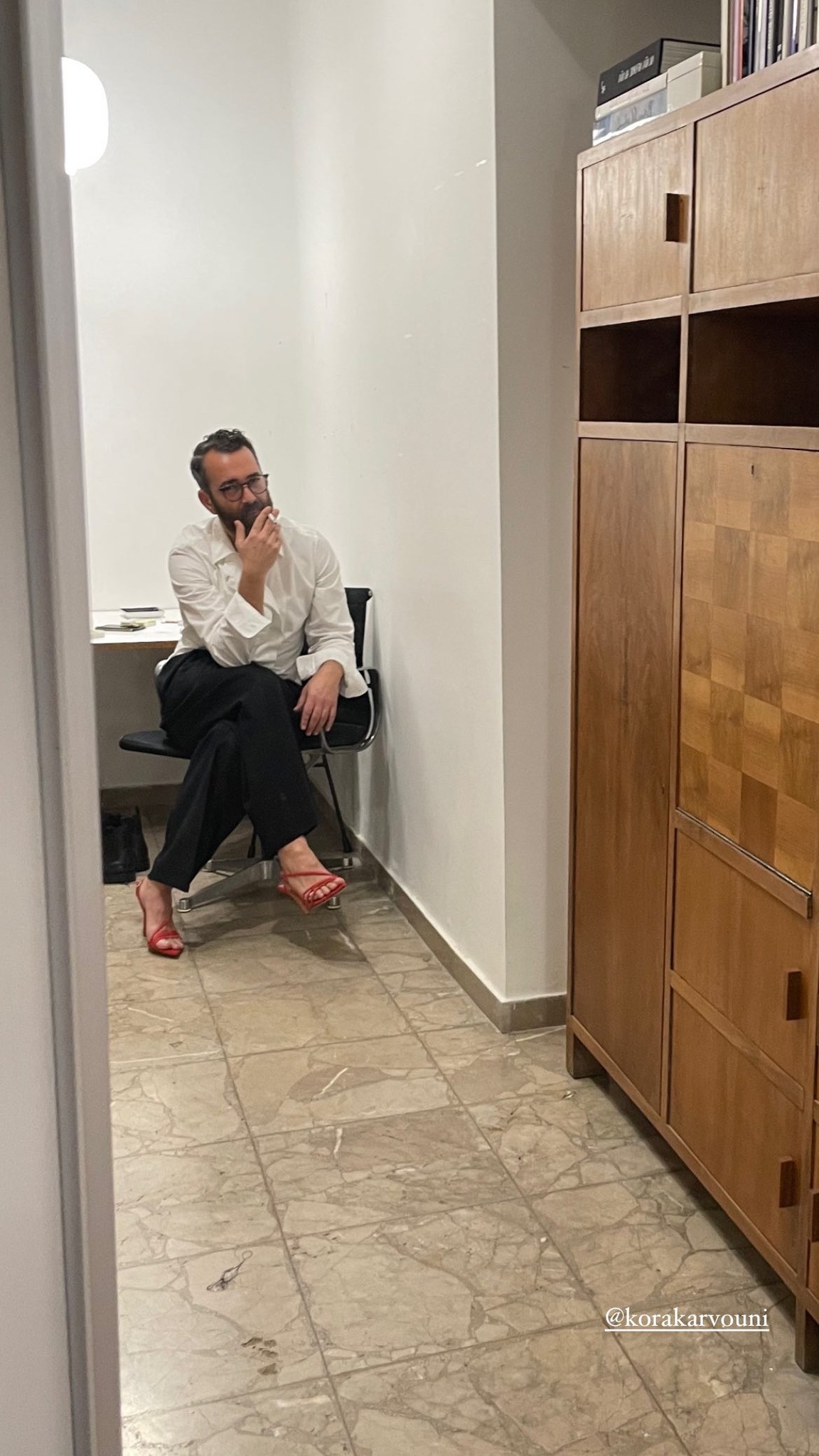 Συγκεκριμένα, ο γνωστός σχεδιαστής μόδας πόζαρε με ασπρόμαυρο outfit και κόκκινα πέδιλα, καπνίζοντας ένα τσιγάρο στο γραφείο.