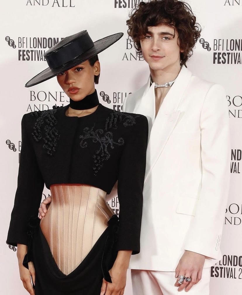 Ο Timothée Chalamet μπορεί να βρίσκεται αυτή τη περίοδο στη μέση των γυρισμάτων της ταινίας Dune: Part II ωστόσο βρίσκει το χρόνο για δημόσιες εμφανίσεις. Ο ηθοποιός στις πρεμιέρες των ταινιών που παρευρίσκεται, επιλέγει να φοράει ρούχα που ταιριάζουν με το γενικότερο θέμα. Με το ίδιο σκεπτικό λειτούργησε και στην πρεμιέρα της ταινίας όπου και πρωταγωνιστεί “Bones and All”, που πραγματοποιήθηκε στο Λονδίνο. Εμφανίστηκε φορώντας ένα άσπρο κοστούμι από τον οίκο Alexander McQueen, με ασύμμετρο γιακά, εφαρμοστό παντελόνι και λευκές μπότες. Γύρω από τον λαιμό του φορούσε ένα Vivienne Westwood τσόκερ, το οποίο αποτελούταν από ασημένια «κόκαλα» με διαμάντια. Ένα τέλεια εναρμονισμένο σύνολο με την ταινία θρίλερ που έκανε πρεμιέρα εκείνο το βράδυ -ρομαντικό αλλά και extreme.