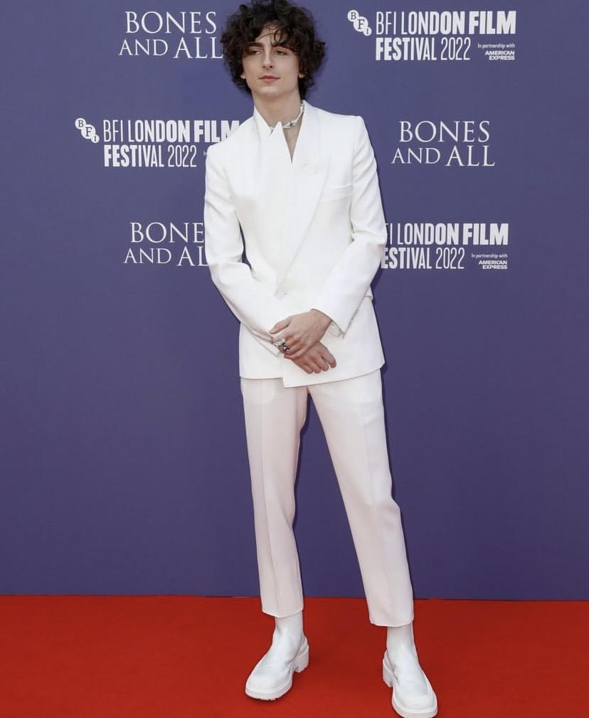 Ο Timothée Chalamet μπορεί να βρίσκεται αυτή τη περίοδο στη μέση των γυρισμάτων της ταινίας Dune: Part II ωστόσο βρίσκει το χρόνο για δημόσιες εμφανίσεις. Ο ηθοποιός στις πρεμιέρες των ταινιών που παρευρίσκεται, επιλέγει να φοράει ρούχα που ταιριάζουν με το γενικότερο θέμα. Με το ίδιο σκεπτικό λειτούργησε και στην πρεμιέρα της ταινίας όπου και πρωταγωνιστεί “Bones and All”, που πραγματοποιήθηκε στο Λονδίνο. Εμφανίστηκε φορώντας ένα άσπρο κοστούμι από τον οίκο Alexander McQueen, με ασύμμετρο γιακά, εφαρμοστό παντελόνι και λευκές μπότες. Γύρω από τον λαιμό του φορούσε ένα Vivienne Westwood τσόκερ, το οποίο αποτελούταν από ασημένια «κόκαλα» με διαμάντια. Ένα τέλεια εναρμονισμένο σύνολο με την ταινία θρίλερ που έκανε πρεμιέρα εκείνο το βράδυ -ρομαντικό αλλά και extreme.