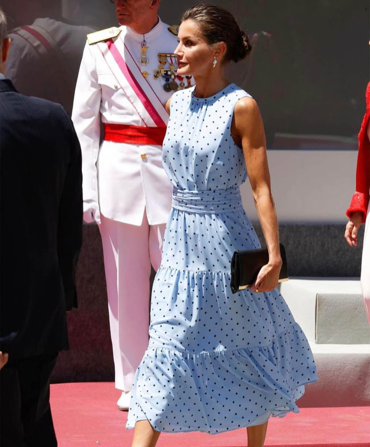 Το feminine πουά: με τα ρομαντικά βολάν στο πιο δροσερό χρώμα του καλοκαιριού. Η Queen Letizia λατρεύει τα αέρινα midi φορέματα, αλλά δεν ξεχνάει ποτέ να τονίζει τη μέση της με ζώνες ή έξυπνα tricks που αναδεικνύουν ακόμα περισσότερο την έμφυτη θηλυκότητά της.