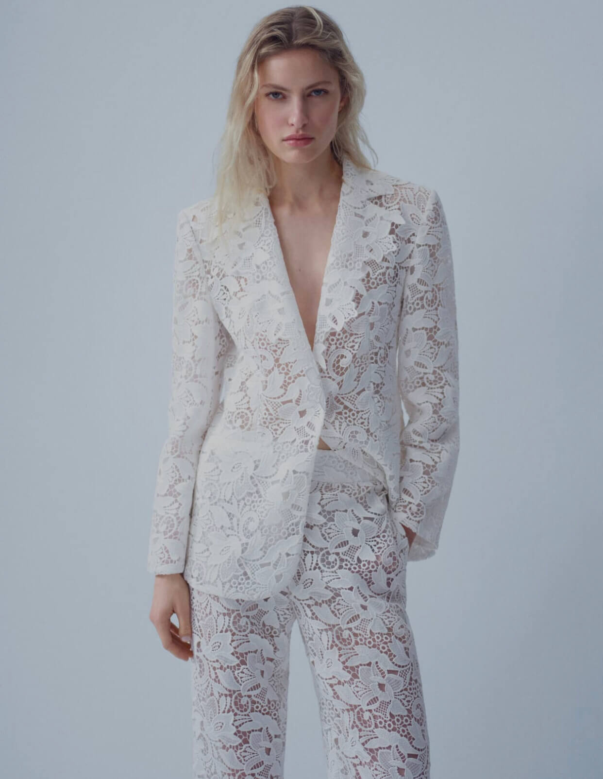 Για μια εμφάνιση που ξεχωρίζει, επιλέξτε ένα λευκό κοστούμι με δαντέλα. Φρέσκο, κομψό, και απόλυτα εορταστικό, αυτό το set θα σας βάλει αυτόματα στο χιονισμένο mood του χειμώνα. Και μην ξεχάσετε το πιο φλογερό σας κραγιόν.
