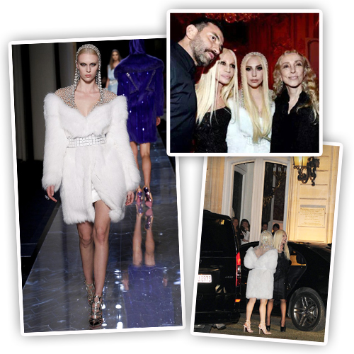 Αυτά φαίνεται να σκέφτηκε και η Lady Gaga, η οποία εθεάθη να το φορά (σε συνδυασμό με το λευκό γούνινο παλτό που θαυμάσαμε και στο catwalk) στο δείπνο που ακολούθησε μετά το show, στο οποίο ήταν επίτιμη καλεσμένη της Donatella. Μαθαίνουμε ακόμα ότι η Lady Gaga δε δίστασε να ζητήσει να το κρατήσει, κάτι που φυσικά της επετράπη. Εξάλλου, το tweet της με την φωτογραφία της ίδιας ανάμεσα στη Donatella Versace, τον Riccardo Tisci και την Franca Sozzani, το οποίο συνόδευσε με την φράση «Φορώντας λευκή γούνα και κρυστάλλινη καλύπτρα #offtherunway», φανέρωνε ότι της το έκαναν το χατίρι.