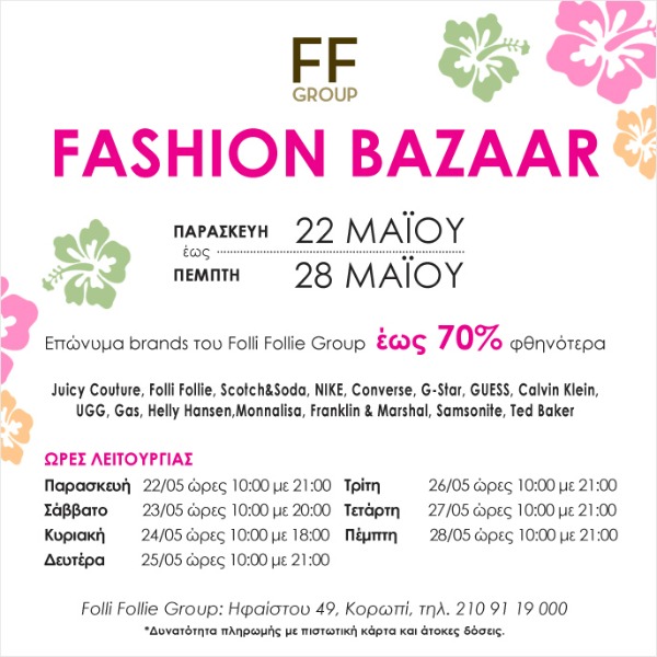 Το Folli Follie Group διοργανώνει και φέτος ένα πολύ μεγάλο fashion bazaar για όλους όσους θέλουν να αποκτήσουν επώνυμα ρούχα και αξεσουάρ με εκπτώσεις που φτάνουν ακόμα και το 70%. Από τις 22 μέχρι τις 28 Μαΐου μπορείτε να επισκεφθείτε τις εγκαταστάσεις του FF Group στο Κορωπί και να αναζητήσετε αυτά που σας ταιριάζουν ανάμεσα σε γνωστά brands όπως Juicy Couture, Folli Follie, Nike, Converse, Calvin Klein και πολλά άλλα.