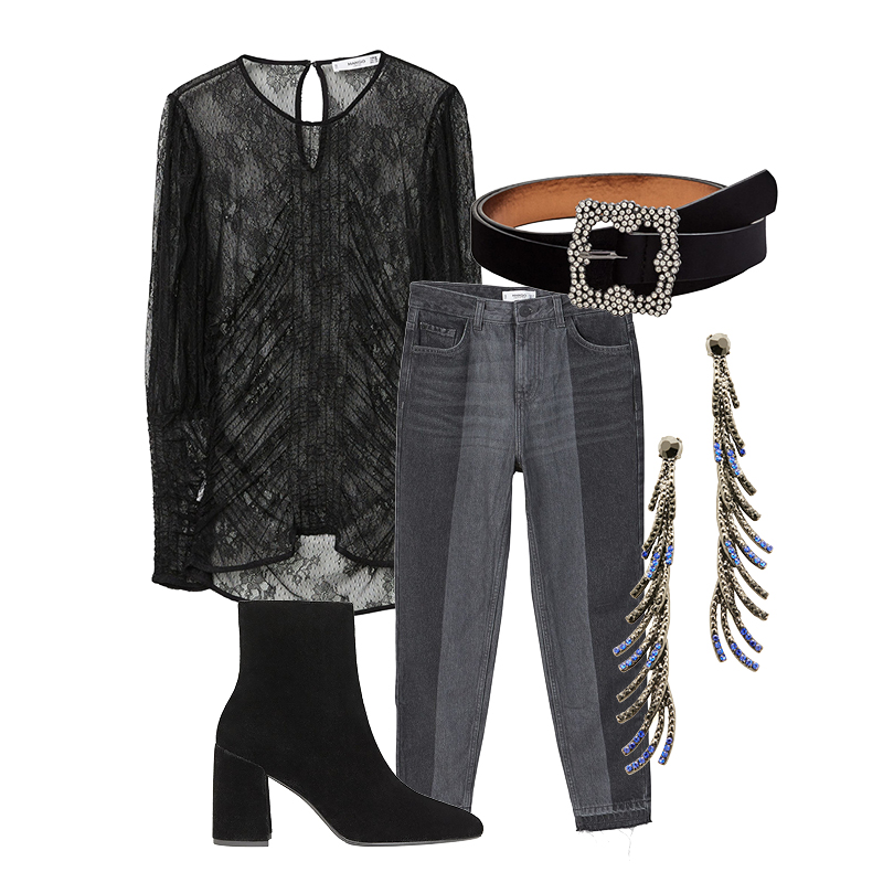 Για εσάς που λατρεύετε τα party outfits αλλά δεν θέλετε να φύγετε πολύ από την καθημερινή σας uniform, ένα παντελόνι που θυμίζει jeans είναι ό,τι πρέπει. Το τοπ από δαντέλα και ένα ζευγάρι ψηλοτάκουνα μποτάκια θα του δώσουν τη διάθεση που πρέπει, ενώ τα αξεσουάρ, όπως μια ζώνη και ένα ζευγάρι statement σκουλαρίκια είναι αυτά που τελικά θα απογειώσουν το σύνολο.