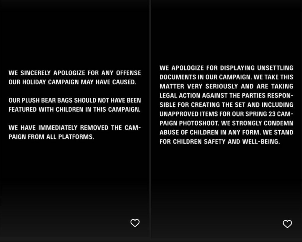 Μετά την κατακραυγή, ο οίκος Balenciaga απολογήθηκε ανεβάζοντας ένα story στον λογαριασμό του στο Instagram και μεταξύ άλλων έγραψε. «Ζητούμε ειλικρινά συγνώμη για οποιαδήποτε προσβολή μπορεί να προκάλεσε η εορταστική μας καμπάνια. Οι βελούδινες τσάντες με αρκουδάκια δεν θα έπρεπε να είχαν παρουσιαστεί με παιδιά σε αυτή την καμπάνια. Αφαιρέσαμε αμέσως την καμπάνια από όλες τις πλατφόρμες».