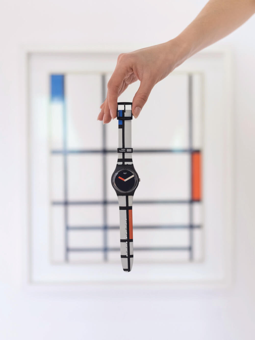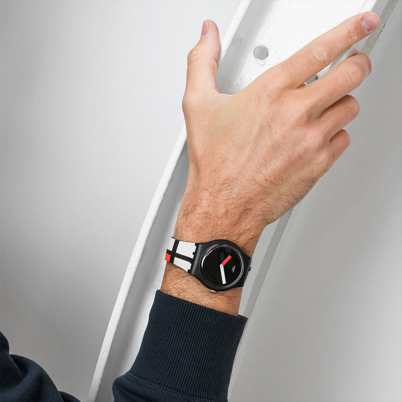 Αποτίνει φόρο τιμής στο ιδρυτή και πατέρα της γεωμετρικής αφηρημένης τέχνης, του οποίου η επιρροή είναι έκδηλη σε τομείς όπως η μόδα, η αρχιτεκτονική και το design. Η Swatch διασφάλισε ότι οι ακριβείς τόνοι του πρωτότυπου έργου απεικονίζονται στο μοντέλο New Gent, που ολοκληρώνεται με μια αμιγώς μαύρη ματ κάσα ρολογιού και έντονους oversized δείκτες.