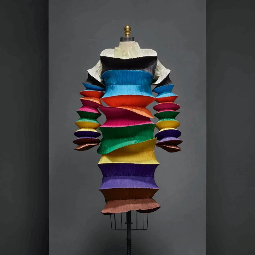 Το φόρεμα Flying Saucer- ιπτάμενος δίσκος– που παρουσιάστηκε κατά τη διάρκεια του σόου του Miyake για την Άνοιξη/ Καλοκαίρι του 1994, κατασκευάστηκε με τη χρήση πτυχωτών δίσκων σε μορφή ακορντεόν και σε αποχρώσεις έντονα χρωματισμένου πολυεστέρα. Έχει μια σιλουέτα που θυμίζει χάρτινο φανάρι, κάτι που δημιουργήθηκε από τον Miyake χρησιμοποιώντας την κατοχυρωμένη με δίπλωμα ευρεσιτεχνίας τεχνική κατασκευής με πτυχωτό πολυεστέρα που επιτρέπει στο ρούχο να συμπιέζεται, να γίνεται επίπεδο και να επεκτείνεται. Αυτό κάνει το φόρεμα να τεντώνει και να αναπηδά όταν το φοράει κάποια. Το φόρεμα αυτό παρουσιάστηκε στην έκθεση ‘Manus x Machina’ του Μητροπολιτικού Μουσείου Τέχνης το 2016, η οποία διερεύνησε την γενικότερη επίδραση της τεχνολογίας στη μόδα.