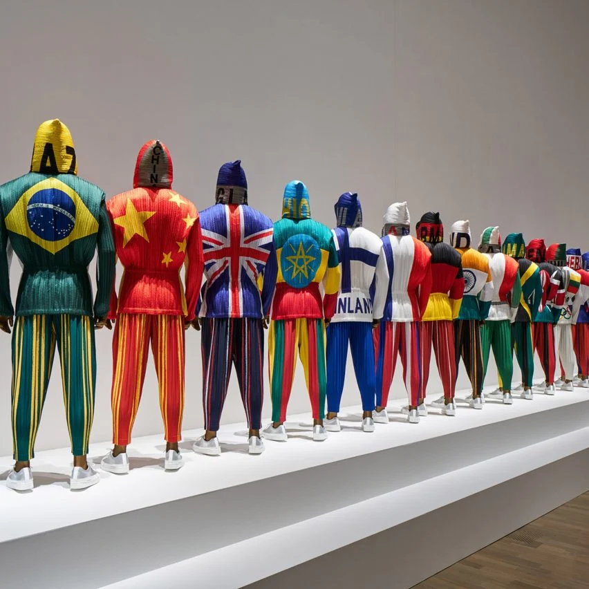 Το 1992, ανατέθηκε στον Miyake να δημιουργήσει ένα σχέδιο ομαδικής εμφάνισης για την πρώτη συμμετοχή της Λιθουανίας στους Ολυμπιακούς Αγώνες, μετά την ανεξαρτησία της χώρας και τη διάλυση της Σοβιετικής Ένωσης. Οι στολές της ομάδας αποτελούνταν από ένα σακάκι με κουκούλα, t-shirt μπλουζάκια και ασημί, πτυχωτό παντελόνι κατασκευασμένο από νήματα πολυεστέρας, στο στυλ της ιδιαίτερης τεχνοτροπίας του σχεδιαστή. Ο Miyake στη συνέχεια επέκτεινε την δουλειά αυτή και δημιούργησε μια συλλογή από επώνυμες στολές, πάντα με άφθονες πτυχές, στα χρώματα των σημαιών πολλών χωρών. Κάθε μία από τις εμφανίσεις αυτές, όπως παρουσιάστηκαν σε μια αναδρομική έκθεση στο Εθνικό Κέντρο Τέχνης του Τόκιο το 2016, περιελάμβανε τις επίσημες εθνικές σημαίες και τα ονόματα των χωρών πάνω στην κουκούλα και στο πίσω μέρος των μπουφάν.