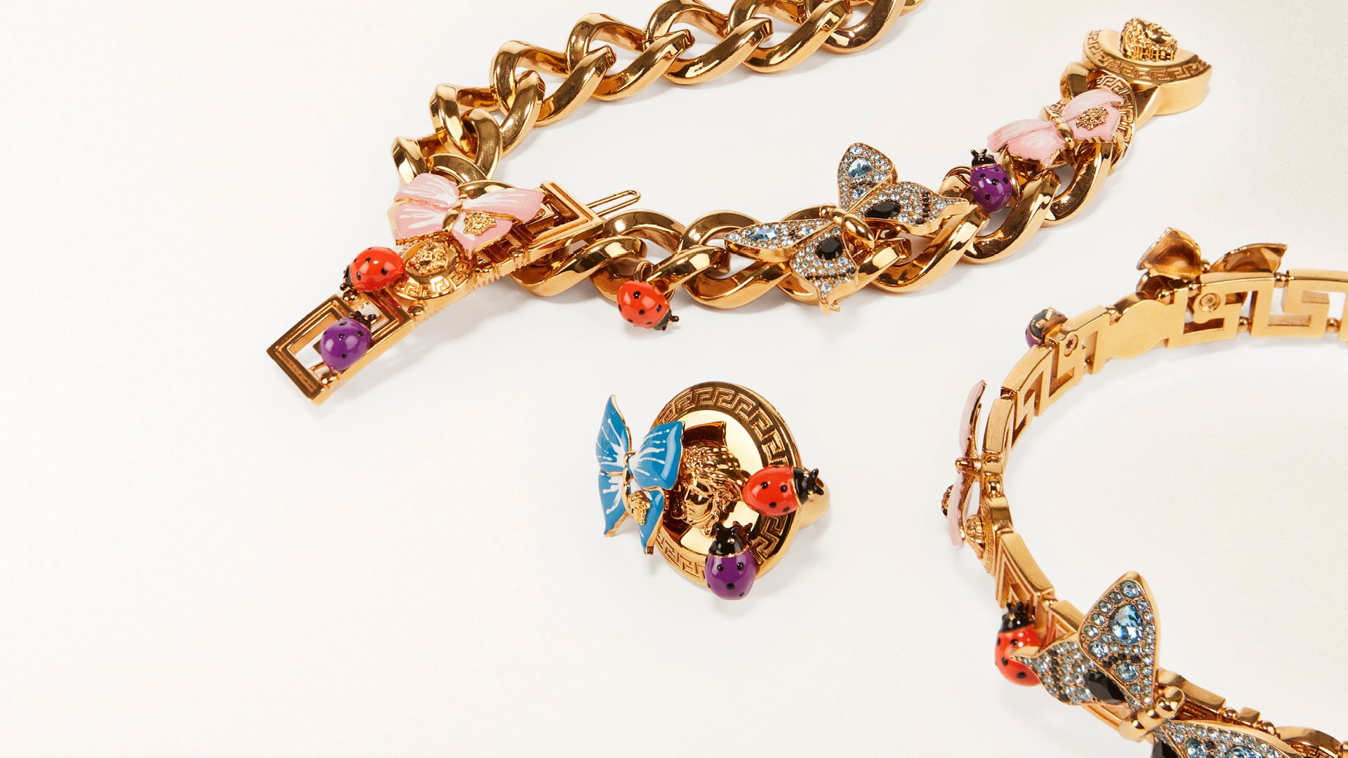 Chunky χρυσαφένια chokers με το σύμβολο του οίκο, τη Μέδουσα, ενισχύθηκαν με πολύχρωμες πεταλούδες και πασχαλίτσες. Το ίδιο και τα σκουλαρίκια και τα βραχιόλια που στόλιζαν τους καρπούς των μοντέλων.