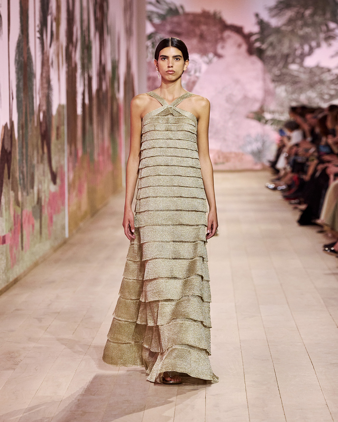Τα μοντέλα συνέθεσαν μια ιερατική ακολουθία σαν στα βήματα όλων των θεοτήτων που κυβέρνησαν και κυβερνούν τον κόσμο. Κάθετη σιλουέτα, φλατ παπούτσια. Τα χρώματα που επιλέχθηκαν είναι λευκό, μπεζ, ασημί και απαλό χρυσό. Με κάθε νέα ματιά, η Maria Crazia Chiuri διαιωνίζει τη λατρεία της θεάς και ερμηνεύει εκ νέου τα ιδρυτικά εμβλήματα της Αρχαιότητας.