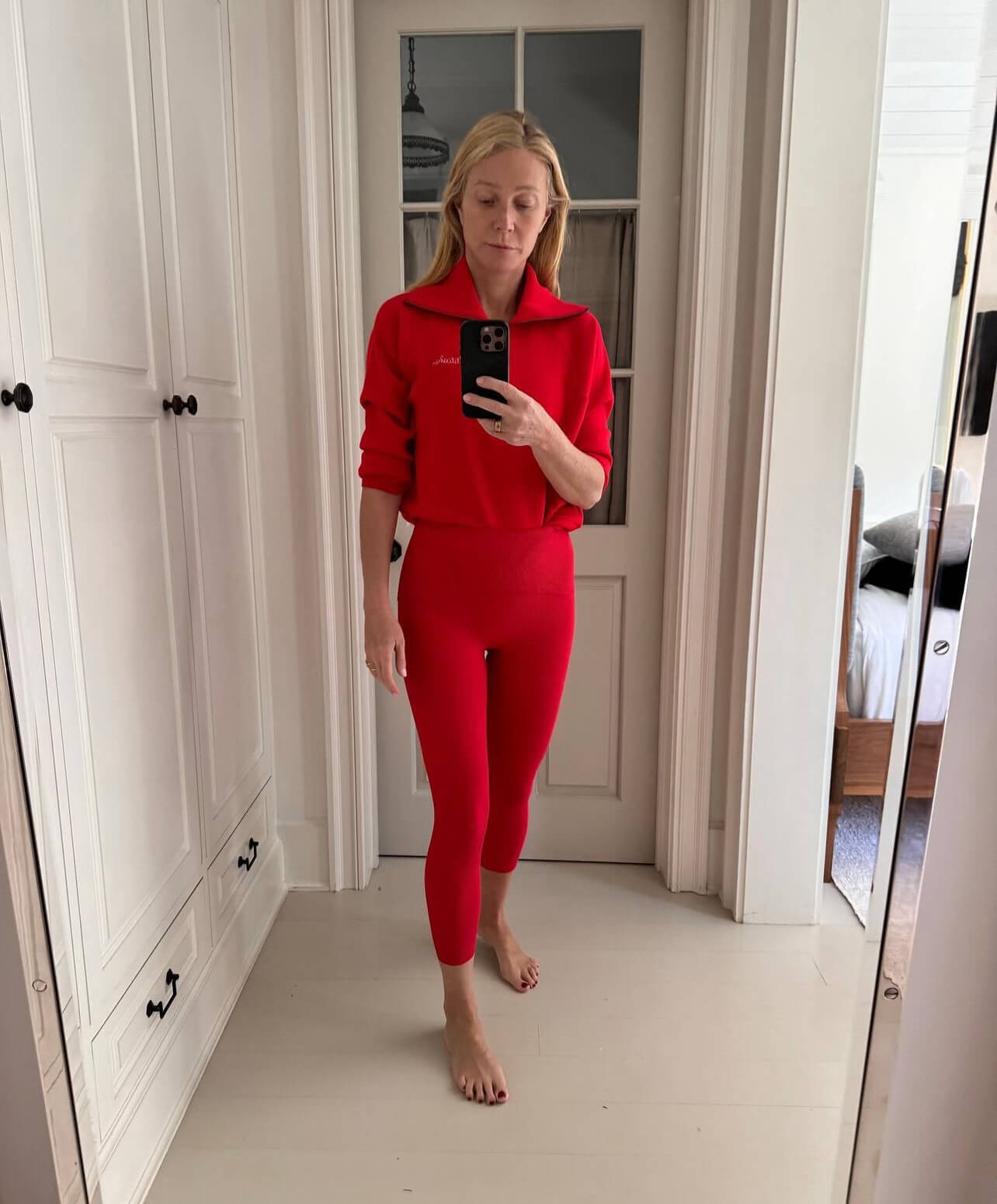Η σταρ λοιπόν, πόζαρε με κόκκινο ψηλόμεσο κολάν και ασορτί κόκκινο πουλόβερ με φερμουάρ στον γιακά, κάνοντας το total red τάση και για το γυμναστήριο. Το look συνόδευσαν τα επιμελώς ατημέλητα ξανθά μαλλιά της και τα επίσης κόκκινα νύχια της στα πόδια.