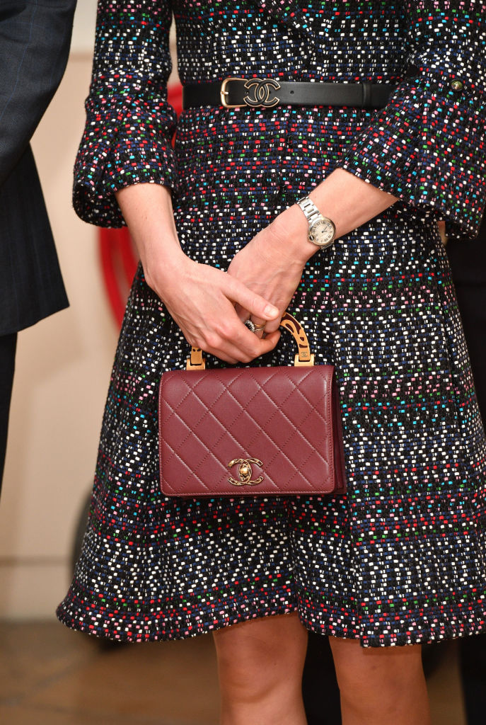 Η Kate λοιπόν επέλεξε ένα tweed ημίπαλτο, με την υπογραφή του γνωστού Οίκου, το οποίο φόρεσε σαν φόρεμα. Υπέροχα χρώματα, κατάλληλα γι’ αυτή την εποχή και θηλυκή, πολύ κομψή γραμμή, τόνιζε τη σιλουέτα της με τον καλύτερο τρόπο ενώ και η Chanel δερμάτινη ζώνη που φόρεσε στη μέση ήταν ιδανική επιλογή για το συγκεκριμένο look. Φυσικά απαρατήρητη δε θα μπορούσε να περάσει η μπορντό, δερμάτινη, Chanel τσάντα της, η οποία, αν και χωρούσε μόνο τα απαραίτητα, ήταν πραγματικά υπέροχη.