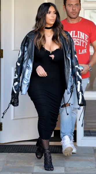 H Κim Kardashian απαθανατίστηκε σε μια έξοδό της στο Los Angeles, απαλλαγμένη από τα περισσότερα κιλά της εγκυμοσύνης και με ένα look που την κολάκευε ιδιαίτερα. Η reality star επέλεξε ένα κολλητό μαύρο φόρεμα με ντεκολτέ, Alexander Wang, το οποίο συνδύασε με ένα jacket που είχε ζωγραφισμένο το πρόσωπό της, Blue Blank. Ολοκλήρωσε το look με πέδιλα Tom Ford και ένα υφασμάτινο choker στον λαιμό. ]]>