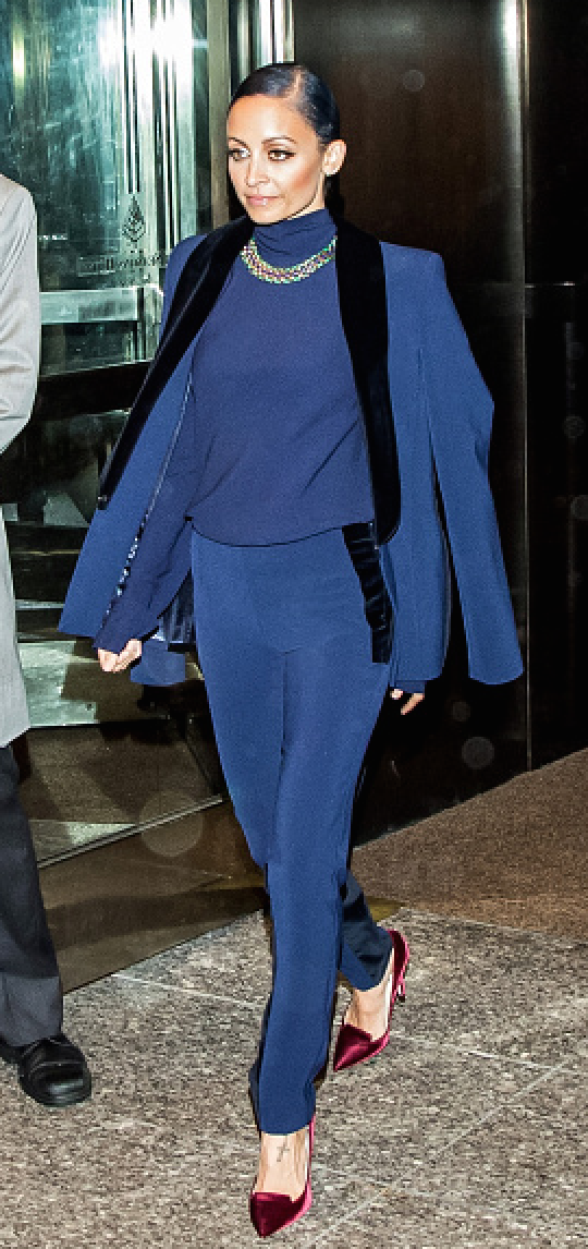 Η Nicole Richie είναι μία celebrity που τολμάει πολλά και διαφορετικά στιλ και μπορεί να υποστηρίξει σχεδόν τα πάντα. Πρόσφατα ο φακός τη συνέλαβε με ένα μπλε κοστούμι με μπλούζα στην ίδια απόχρωση από τη συλλογή του Οίκου SAFiYAA για την τρέχουσα σεζόν. Μας άρεσε πολύ το γεγονός ότι το συνδύασε με τις γόβες Ari του Jimmy Choo σε σκούρο κόκκινο ενώ σίγουρα το look αναβαθμίστηκε με το statement κολιέ της.