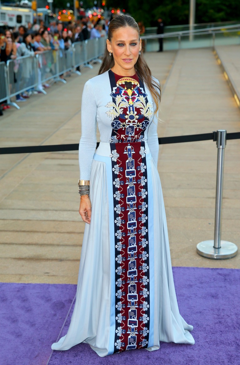 H Sarah Jessica Parker έδωσε το παρών στο φθινοπωρινό gala του New York City Ballet με ένα εντυπωσιακό maxi φόρεμα της Ελληνίδας σχεδιάστριας Mary Katrantzou (Fall 2014) στο οποίο ξεχώριζε μία φάσα με κεντημένες λεπτομέρειες σε έντονα χρώματα, που διέτρεχε όλο το φόρεμα. Ολοκλήρωσε το look με απλό hairstyle και smoky μακιγιάζ.