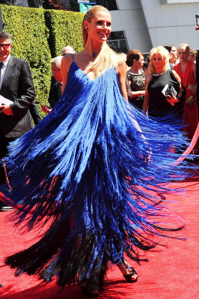 Ποιος είδε το κρόσσι και το φοβήθηκε; Σίγουρα όχι η Heidi Klum που εμφανίστηκε στα Creative Arts Emmy Awards με ένα εντυπωσιακό fringe φόρεμα στην απόχρωση του electric blue που δημιούργησε αποκλειστικά για εκείνη o Sean Kelly, ένας σχεδιαστής από την τρέχουσα σεζόν του Project Runway, του reality που παρουσιάζει η όμορφη celebrity. Παιχνιδιάρικο και ενδιαφέρον αγαπάμε τα πάντα πάνω σε αυτό το φόρεμα.