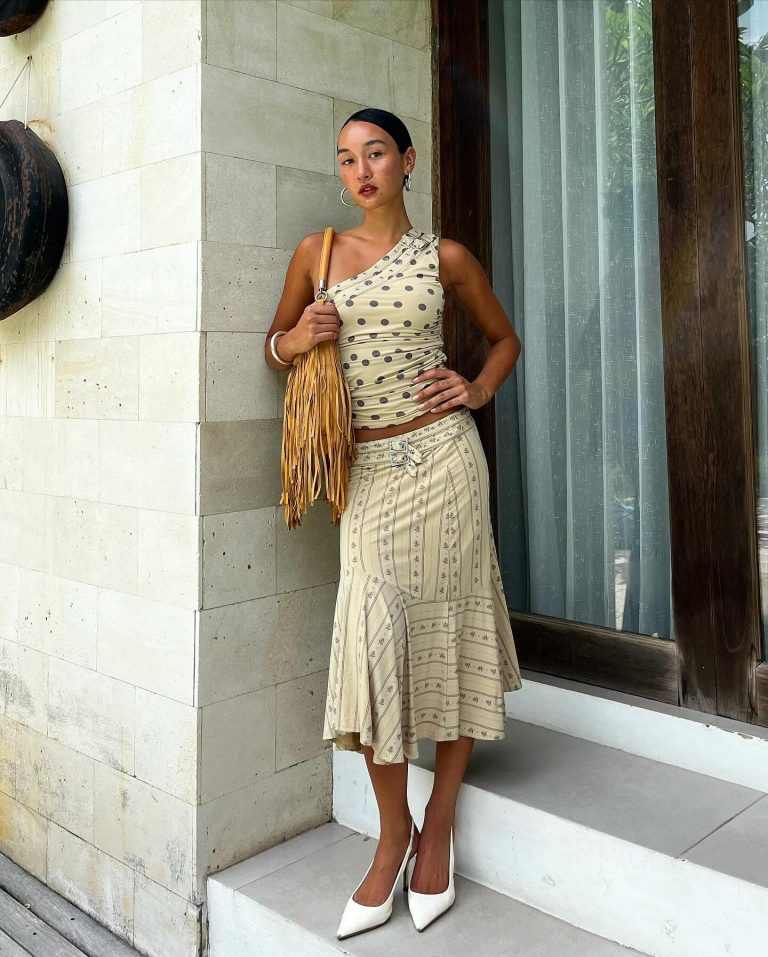 Λειτουργεί ιδανικά με ουδέτερες αποχρώσεις. Σκεφτείτε ένα total look σε off-white, μπεζ ή γκρι τόνους για ένα αποτέλεσμα που μοιάζει αβίαστα κομψό. Θέλουμε κάτι πιο ρομαντικό; Τότε το συνδυάζουμε με μια ανάλαφρη πουκαμίσα ή ένα λεπτό πλεκτό σε soft pastel και ολοκληρώνουμε το outfit με μπαλαρίνες. Είναι ο πιο εύκολος τρόπος να δείχνουμε chic χωρίς να φανεί ότι προσπαθήσαμε υπερβολικά.