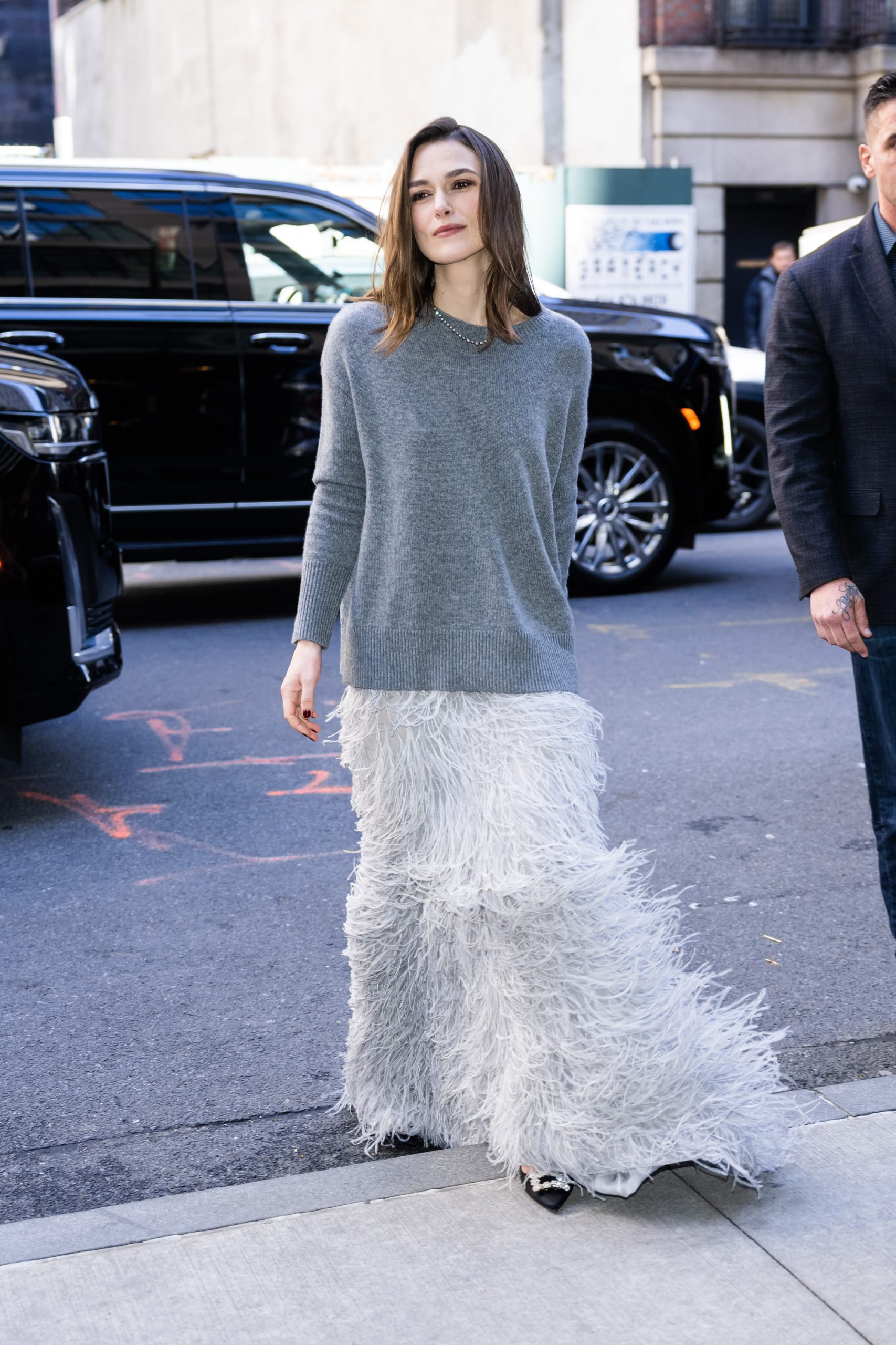Από όλα τα σύνολα που φόρεσε η Keira Knightley για την πρόσφατη press tour στη Νέα Υόρκη –όπου προωθούσε τη νέα της ταινία, Boston Strangler– ξεχώρισε ένα. Σίγουρα, το χρυσοπράσινο φόρεμα Simone Rocha έκλεψε τα φώτα της δημοσιότητας στο The Tonight Show με τον Jimmy Fallon, αλλά ήταν η φτερωτή μάξι φούστα Valentino και ο συνδυασμός με κασμιρένιο γκρι πλεκτό επισκίασαν τα υπόλοιπα.