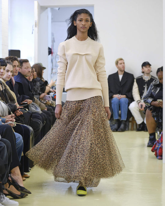 Η Molly Goddard παρουσίασε μια φουσκωτή φούστα με λεοπάρ οτίβο και μπεζ πλεκτό που ενσάρκωναν αυτό το high-low concept. Από την άλλη στον Christopher Kane, κόκκινες βινύλ φούστες με βολάν έκαναν μια δυναμική αντίθεση με τα απλά jumpers και cardigans. Το ίδιο θα μπορούσαμε να πούμε για τον συνδυασμό δερμάτινης φούστας και jumper της Gabriela Hearst, που συνοδεύεται από δερμάτινα γάντια και μπότες με κορδόνια για επιπλέον drama.