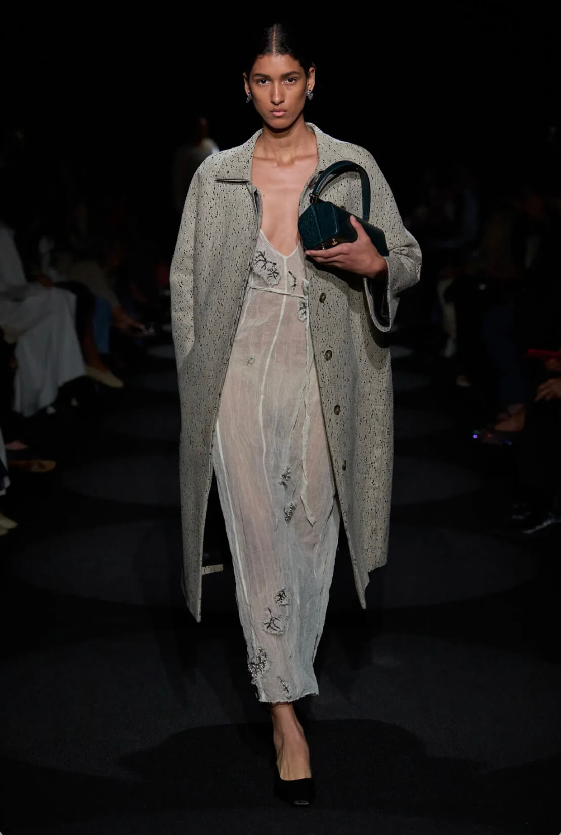Μια τολμηρή συνδυαστική επιλογή που «παντρεύει» την cozy υφή του μάλλινου παλτό με τη διαφάνεια ενός φορέματος. Το αποτέλεσμα; Ένας συναρπαστικός συνδυασμός θηλυκότητας και αυστηρότητας που λειτουργεί σε κάθε περίπτωση.