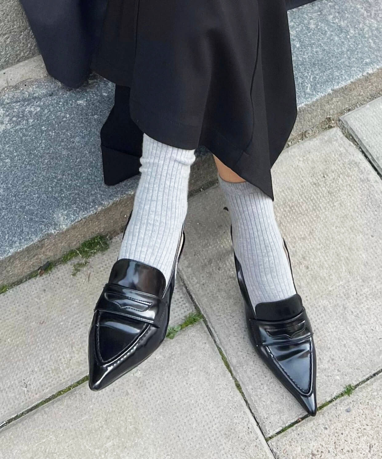 Το ανατρεπτικό αυτό σχέδιο πρωτοεμφανίστηκε στην πασαρέλα της Miu Miu την Άνοιξη του 2022, με το όνομα “penny loafers”, τα οποία είχαν λεπτή μύτη, λουράκι slingback (για ελευθερία στη φτέρνα) και κοντό τακούνι. Από τότε, ξέσπασε ένας πραγματικός παροξυσμός, καθορίζοντας νέους κανόνες για την ανανεωμένη ρετρό κομψότητα.